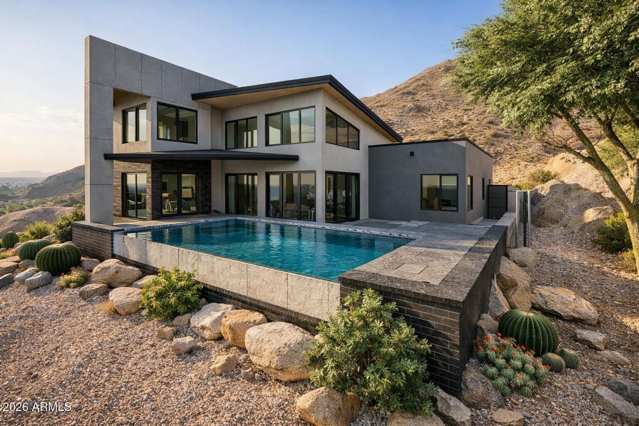 TO BE BUILT - Exceptional new-construction opportunity on an 8,712-square-foot hillside lot located within the highly desirable, gated Mount Central Place community. Residents enjoy premium community amenities including a heated pool, tennis courts, and direct access to scenic hiking trails, creating an ideal balance of luxury living and outdoor recreation. This offering includes a newly issued building permit for a spectacular custom modern home with a private pool, allowing construction to begin immediately. Livable square footage 2,515 with an under roof 2 car garage at almost 500 square feet. Private infinity pool with direct view of downtown Phoenix. Perfect for a buyer seeking to build a dream residence