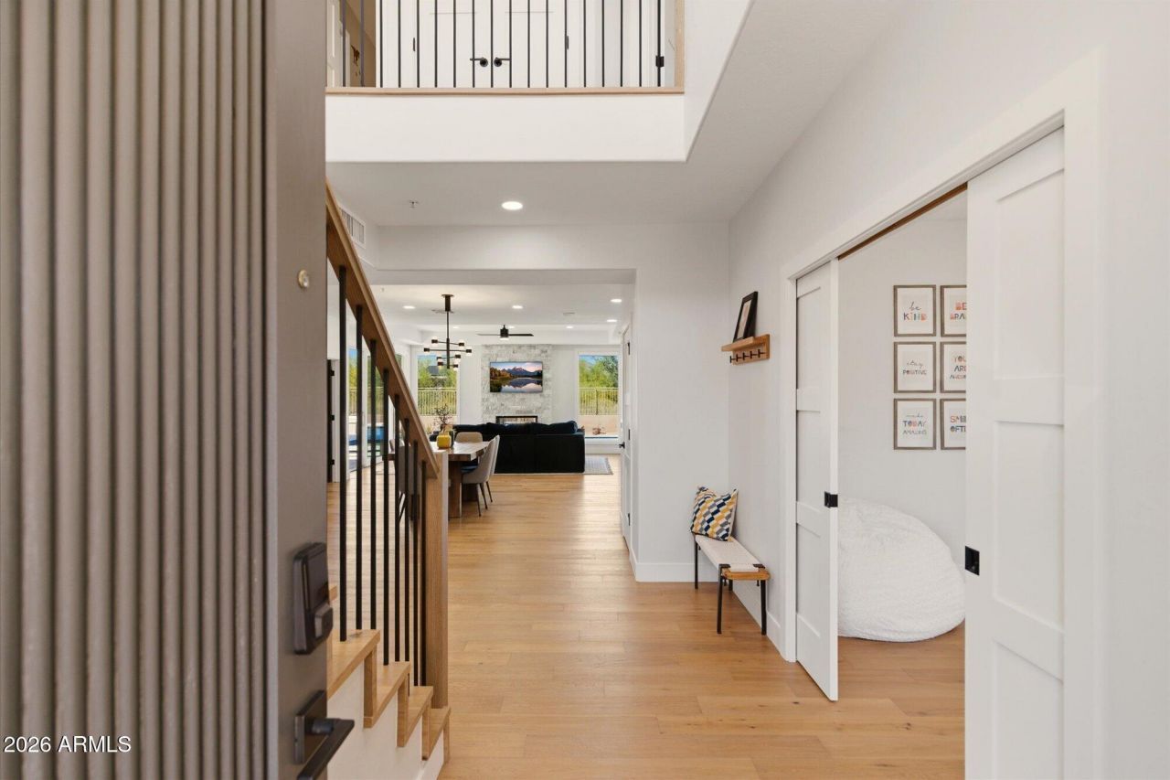 Fully remodeled 4 bedroom, 4 bathroom home offers 3,390 square feet of updated living space, mountain views, and a contemporary backyard designed for Arizona living in the desirable McDowell Mountain Ranch community.The kitchen was completely remodeled in 2022 and is truly the heart of the home. Quartz countertops, a large, 9.5 ft long island with storage, herringbone tile backsplash, built-in refrigerator, double ovens, microwave drawer, and a spacious walk-in pantry with a second refrigerator make it as practical as it is beautiful. The layout is both functional and flexible. First floor includes a private office with double doors and closet, a flex room with double pocket doors that can be closed off for a media room or bonus space, and a fully remodeled bathroom. Engineered hardwood floors run throughout the downstairs, complemented by new solid core doors, updated lighting, LED fixtures, and a striking wood and metal staircase. Floor to ceiling windows in the family room bring in natural light and highlight the stacked travertine stone fireplace.Upstairs, all four bedrooms feature en suite bathrooms and walk-in closets, a rare and highly desirable layout. The primary suite offers mountain views from a private balcony, along with a fully remodeled spa-like bath completed in 2019 with a free-standing soaking tub, enclosed tiled shower, and two closets.The backyard was fully redesigned in 2022 and feels like a private retreat backing to a wash. The PebbleTec pool and spa, gas fire pit, built-in BBQ with travertine countertop, louvered pergola, putting green, and turf create multiple spaces to relax or entertain. An RV gate, above-ground garden beds, storage shed, and updated front landscaping add more beauty and functionality.Additional upgrades include multiple AC units replaced (2022), a remodeled laundry room, epoxy garage floors in the 3-car garage, and a freshly painted exterior.Living in McDowell Mountain Ranch means access to recreation centers, hobby clubs and special events, plus tennis, pickleball, basketball courts, heated pools and spas, playgrounds, and miles of walking and biking paths. Top-rated Desert Canyon Elementary/Middle School, Arabian library, and public golf are located within the neighborhood. Easy access to Scottsdales best shopping, dining and the 101 Freeway. This is a rare opportunity - a move-in ready, remodeled home in a special, desirable community.