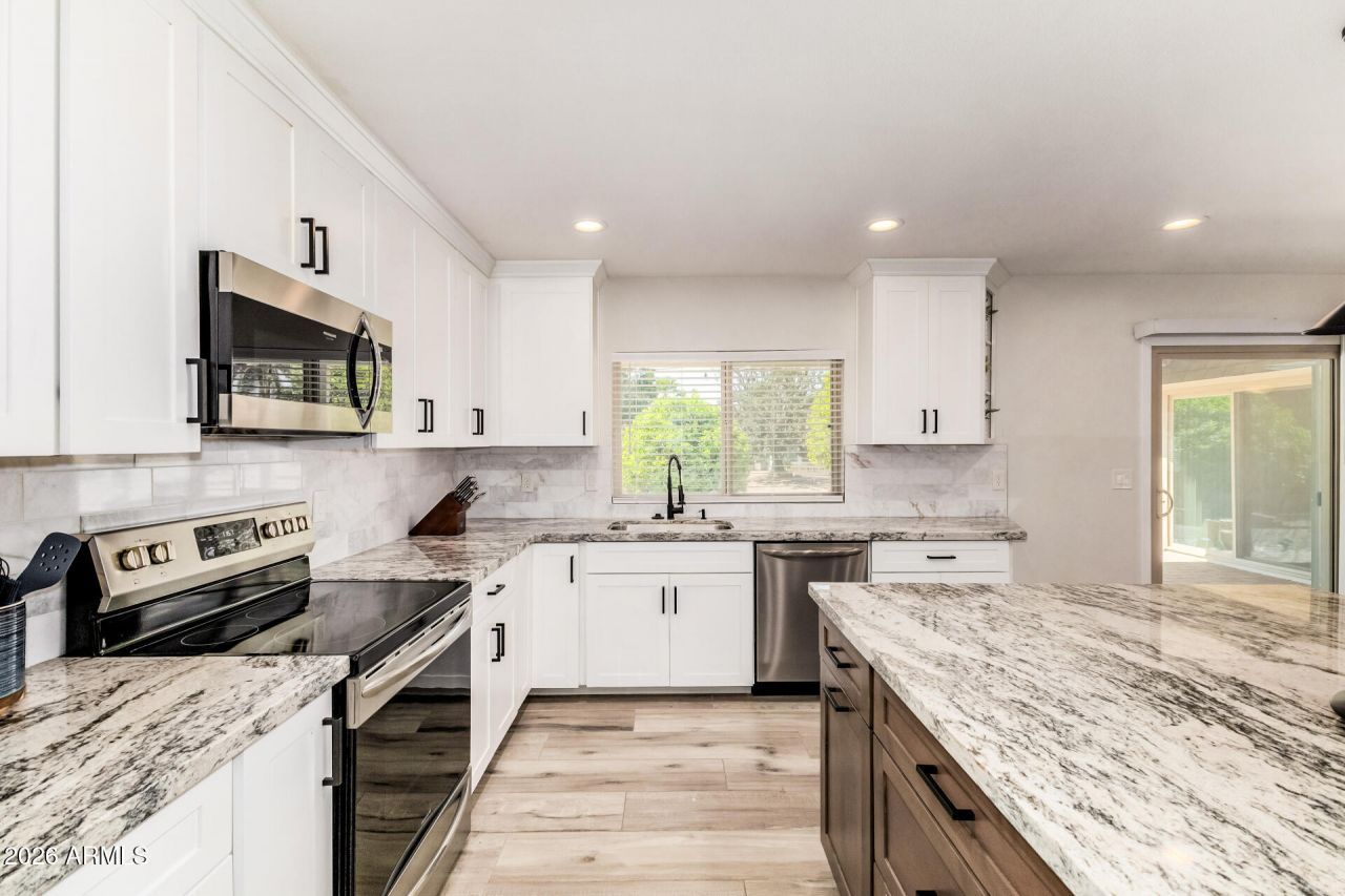 Rare true 3-bedroom, 3-bath home in Sun City--fully remodeled and move-in ready with NO HOA. This thoughtfully updated home offers the space many buyers are looking for, including comfortable guest space for visiting family and friends with a SECONDARY BEDROOM SUITE with a private bath & walk in closet, along with room for hobbies or a home office.The updated kitchen features a large island, built-in beverage bar, updated lighting, and stylish finishes, while large plank tile flooring provides durability and LOW-MAINTENANCE living throughout. The home includes two beautiful custom tile walk-in showers, along with a shower/tub combination in the guest bath.Major systems have already been replaced for peace of mind, including the ROOF, HVAC, and water heater in 2022. The backyard offers a relaxing outdoor retreat with citrus trees, a fire pit seating area, a peaceful water feature, perfect for enjoying Arizonas beautiful weather. The garage features upgraded epoxy flooring, creating a clean, polished space.Enjoy the best of Sun Citys vibrant 55+ lifestyle, with recreation centers, golf courses, pools and spas, fitness centers, pickleball, clubs, and year-round social activities.A rare move-in ready 3-bedroom, 3-bath opportunity in Sun City you wont want to miss.