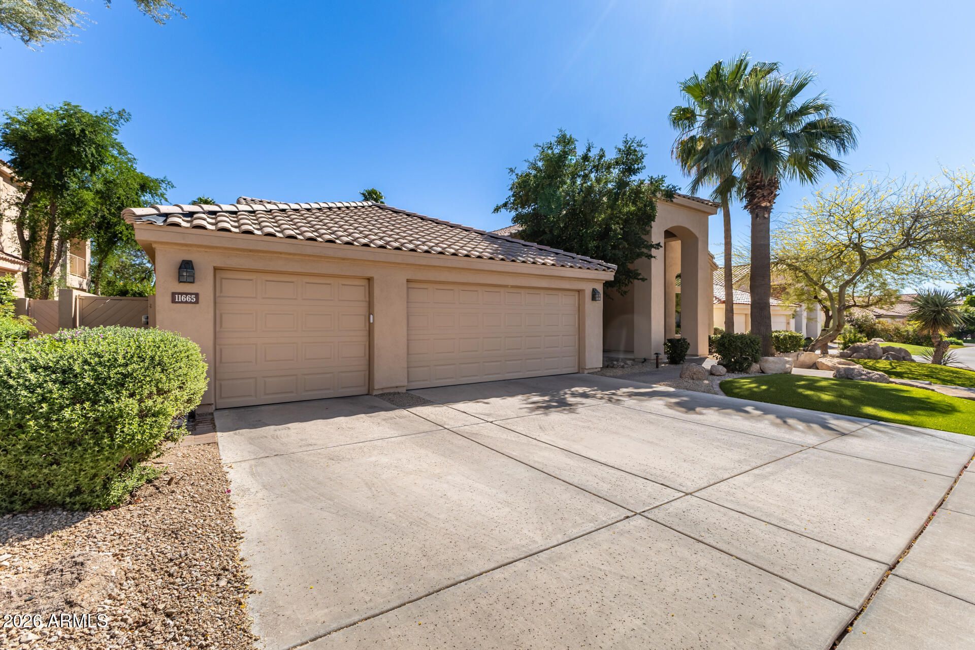 Become the proud owner of this gorgeous property in Stonegate! Discover a 4-bed/2-bath, 3-car garage and a beautifully landscaped front yard with mature trees and pristine artificial turf. Fall in love with the captivating living room, which features vaulted ceilings, half-moon windows for abundant natural light, a soothing palette, and durable tile flooring. Spend intimate moments with loved ones in the spacious great room, complete with a dry bar for entertaining and a cozy fireplace. The stunning chefs kitchen includes granite counters, elegant white cabinetry with crown moulding, a tile backsplash, stainless steel appliances, and a peninsula with a breakfast bar for casual dining. The luxurious primary bedroom boasts double French doors leading to the backyard for seamless . . . indoor-outdoor living, classic plantation shutters, a lavish ensuite with dual sinks, and a walk-in closet. Imagine peaceful evenings in the enchanting backyard, which features a covered patio, stylish pavers, a relaxing spa, and a putting green for golf enthusiasts. Dont miss out on this incredible gem! *Please see docs tab for a full list of upgrades*