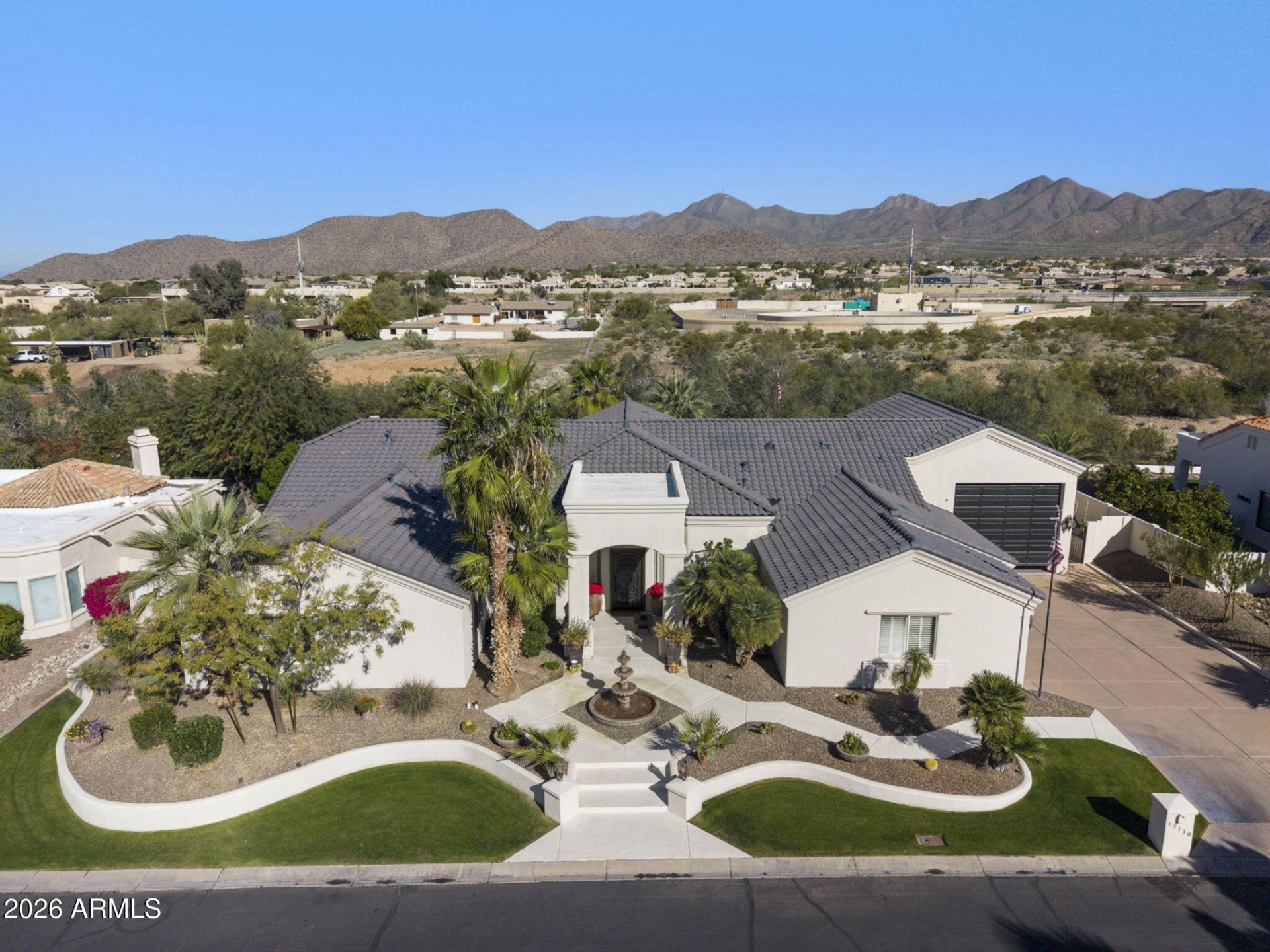 Set within the gated community of Pueblo Bonito, this 5 bed/5 bath single level residence spans 4,591 sqft on a 20,000 sqft lot with open desert and mountain horizons. A fully integrated RV garage, rare within an HOA and thoughtfully designed to match the architecture of the home, sets this property apart from nearly anything comparable in the area.Vaulted ceilings elevate the main living spaces, while generous windows and long sightlines frame the surrounding landscape. The primary suite feels calm and restorative, with a walk in closet and a bath finished in quartzite.The kitchen serves as the natural center of the home and connects easily to multiple living and gathering areas. A wine bar, oversized laundry room, dedicated pool bath with shower, and well planned storage support comfortable daily living.Care and investment are evident throughout. A new roof was completed in 2024. Air conditioning systems were replaced in 2023 and 2024. Quartzite countertops were added throughout the kitchen, baths, and laundry in 2024, along with a new hot water heater. Garage floors are finished with epoxy for a clean and durable finish.The RV garage blends seamlessly into the architecture rather than standing apart from it, offering space for an RV, boat, collector vehicles, or flexible storage, complemented by a separate three car garage with oversized doors.Outdoor living opens to expansive desert and mountain views that are both wide and private, with spaces designed for quiet mornings and relaxed evenings.
