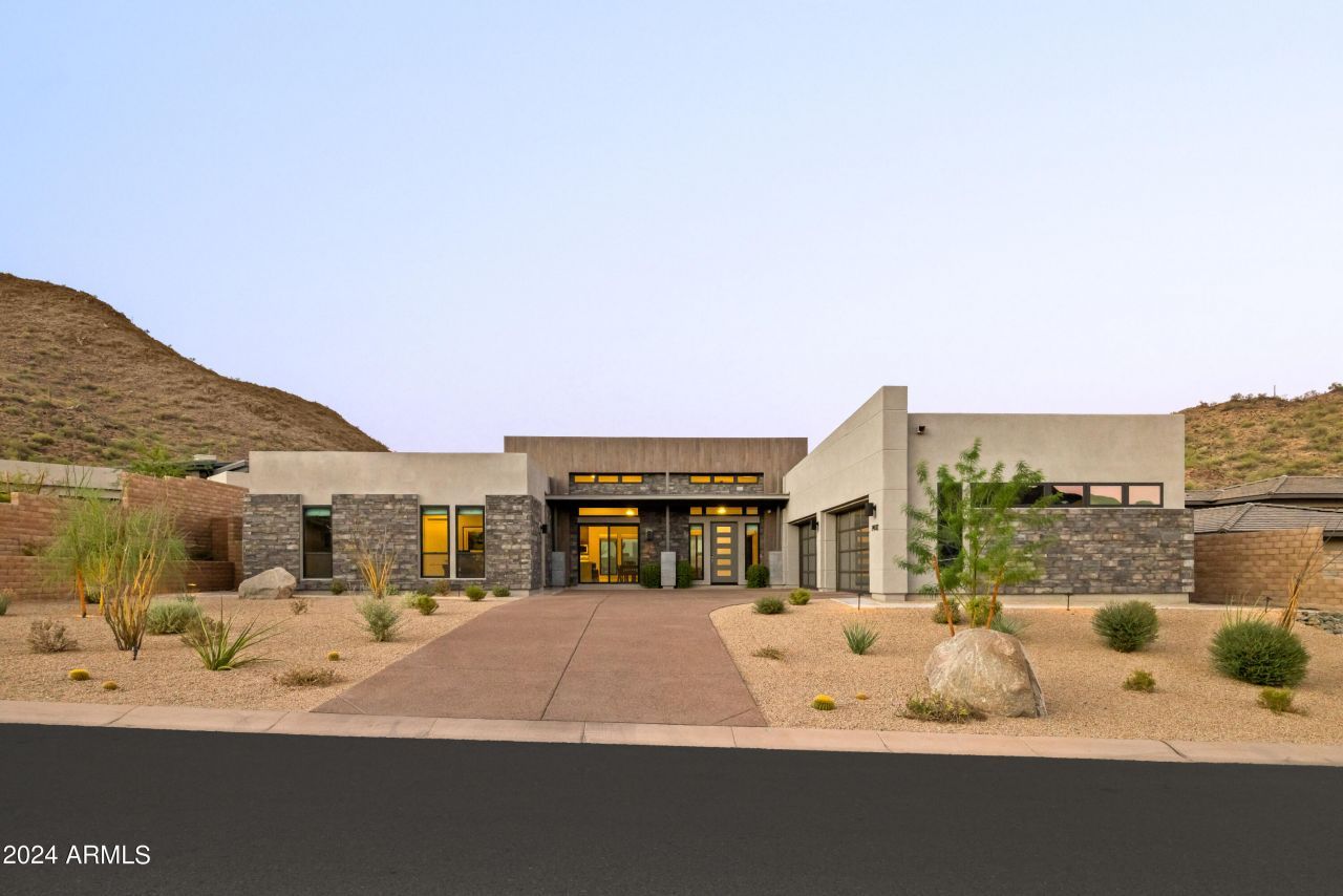 Stunning contemporary home, located in the heart of gated Adero Canyon, is a sanctuary of comfort & elegance presenting an opportunity to experience the best of high-end desert living. The modern architectural design with stone finishes and crisp, clean lines perfectly complements the natural desert backdrop of Sonoran Desert & mountain vistas, creating a welcoming appeal for discerning tastes. Spanning 3708 square feet and including an attached oversized casita, the open-concept Toren model living areas flow effortlessly with the use of premium materials and neutral tones creating a sense of organic luxury and calming ambiance. Marble-like tile floors, 15-foot ceilings, modern chandeliers and lighting, flat roman shade window treatments throughout and a state-of-the-art Control4 home system set the stage for a sophisticated lifestyle with a great room centered around a floor-to-ceiling tile surround linear fireplace, ideal for hosting guests or enjoying quiet moments. The modern kitchen is nestled nearby, with an oversized marble waterfall island providing additional seating & storage. Featuring premium appliances including Wolf dual ovens, 6-burner gas range and SubZero refrigerators, custom oak cabinets, & high-end finishes that reflect the homes modern aesthetic. Whether preparing a casual meal or hosting a dinner party, this space is designed to impress. Designed for function as well as style, the home offers multiple bedrooms, all ensuite & each designed as a private retreat. The spacious primary boasts expansive windows overlooking the private outdoor living space, allowing you to wake to serene beauty every day. The suite is complete with a spa-like bathroom featuring dual vanities with quartz counters, backlit mirrors, 12 wide shower & separate freestanding tub. Additional guest bedrooms are equally peaceful, including one with a Murphy bed for flexible functionality. The oversized attached casita, currently setup as an office & fitness room, offers exterior access for multi-generation living. Outdoor living is just as elegant, with a space designed by Sonoran Landdesign & meticulously finished. Featuring a heated pool with waterfalls, sun shelf and attached spa, the backyard oasis offers multiple areas for lounging including a fire pit for cool desert evenings & a pergola with outdoor kitchen for summer days. Raised beds filled with vegetation & landscaping outline the yard, surrounding the sleek setting with travertine patios, turf landscaping and putting green. The Adero Canyon community, exclusively developed by Toll Brothers, is in walking distance to the Adero Trailhead & minutes from the Adero Club. With easy access to Scottsdale shopping & dining as well as the Mayo Clinic & top-ranked Basis School, this home offers the best of natural surroundings & modern conveniences.