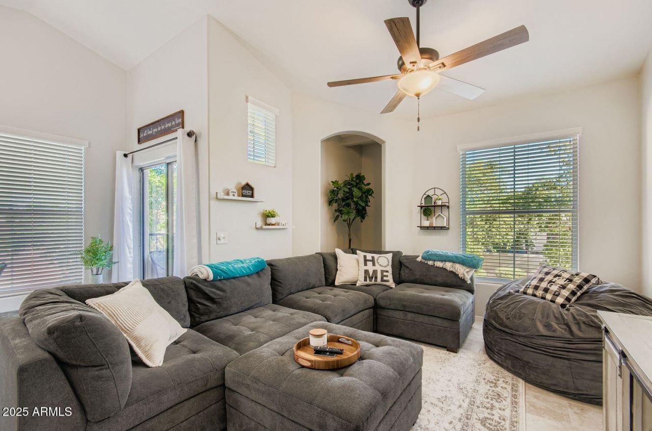 Luxurious gated condo in the heart of Surprise with open, vaulted living spaces. Kitchen features upgraded quartz countertops, new backsplash, and upgraded farmhouse sink with stainless appliances and a pantry. Porcelain tile throughout; dual-pane windows with solar screens. Primary suite offers private balcony, large walk-in closet, dual quartz sinks, and a tiled shower with new fixtures. Guest bedroom has a bonus space for an office; porcelain countertop in guest bath with new vanity and toilet. New HVAC (2024), ceiling fans, and a modern garage with operator, remotes, keypad, and storage. Private first-floor entry; direct access to Reems Rd/Grand Ave; access to pool, gym, theater, and walking trails. Minutes to Surprise Marketplace and Village at Prasada.