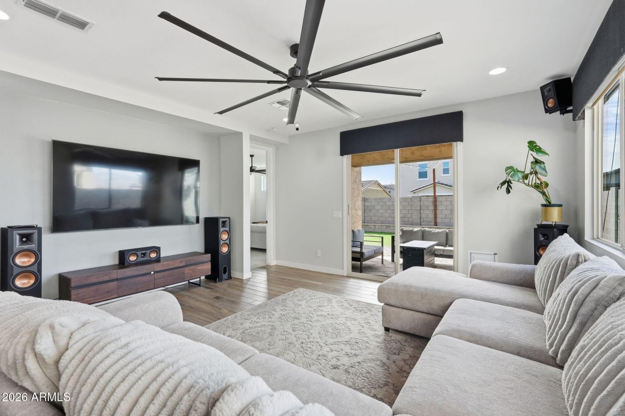This one is special! Built in 2023 and just east of the White Tank Mountains, this home sits in a fast-growing pocket of the West Valley, where dining, shopping, and entertainment are popping up all around. Just minutes from Costco and everyday conveniences, while still offering the quieter feel of a neighborhood where evening walks are a common way to wind down at the end of the day.Inside, the home blends thoughtful design with modern upgrades that make everyday living feel effortless. Automatic indoor shades provide comfort and convenience throughout the home, while the whole-house speaker system allows you to carry your favorite music from room to room. The split primary suite is designed with both space and function in mind, featuring two walk-in closets and a layout that feels like a true retreat. The details continue into the tandem 3 car garage with bright LED lighting for a clean, well-lit workspace. Outside, the low-maintenance landscaping keeps things simple so you can spend more time enjoying the home and the surrounding area. If youre looking for a newer home with modern features and a location with continued growth and development, this one is worth a look.
