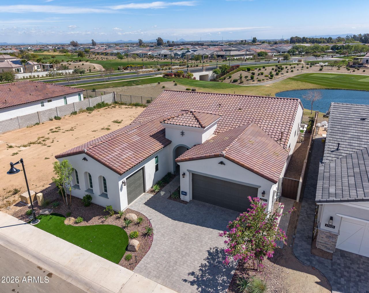 Wake up every day to unobstructed water and golf course views overlooking the 13th hole at Sterling Grove Golf & Country Club, where birds fish along the waters edge and soar overhead--pure Arizona serenity. This two-year-old, very lightly lived-in Spanish Matthews model sits on a premium golf lot and offers refined single-level living designed for comfort and style. The primary suite is a true retreat with a spa-inspired, resort-style bathroom, while two additional en-suite bedrooms provide ideal privacy for guests. A flexible bonus room is perfect for a home office, den, or media space. The chefs kitchen is a showstopper, featuring a quartzite waterfall island, upgraded cabinetry, and high-end finishes. An upgraded laundry room with additional cabinetry and a sink adds... ...everyday convenience. The living and dining spaces are framed by a dramatic 90-degree stacking sliding glass door, creating a seamless indoor-outdoor transition. Step outside to the covered patio with a motorized sun screen, complemented by sun-filtering window screens throughout the home.The backyard is professionally landscaped with travertine tile, low-maintenance turf, a tranquil water feature, and a sunken Jacuzzi hot tub--perfect for relaxing or entertaining. A gas line is already plumbed and ready for your BBQ. Front and backyard lighting complete the outdoor experience.A spacious three-car garage offers ample room for vehicles, golf carts, and other recreational equipment. Community & Lifestyle Sterling Grove is the West Valleys newest premier golf destination, featuring a world-class Nicklaus Design golf course operated by Troon Golf Management Services, thoughtfully designed for both seasoned golfers and newcomers. State-of-the-art practice facilities include a driving range, putting and chipping greens, and an on-site golf simulator.Residents enjoy a resort-style pool, spa services, fitness center, restaurant, and an elegant clubhouse with first-class amenities. Step outside your door to bike or jog through this beautifully landscaped, gated community, all just minutes from shopping and dining at Prasada.Luxury, lifestyle, and views--this is Arizona golf course living at its finest.