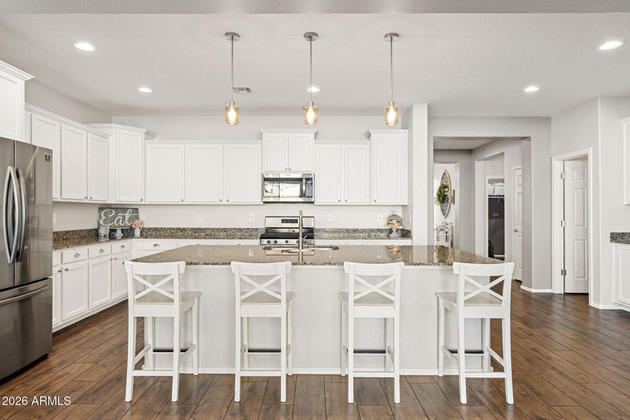 Open & functional layout w/ spacious kitchen featuring oversized island, granite ctrs, SS appl, abundant cabinetry & walk in pantry, open to main living & dining areas. Timeless wood look tile throughout main living spaces adds warmth & durability. Home has been meticulously cared for & shows true pride of ownership. Large primary suite w/ dual vanities, soaking tub, sep walk in shower, private WC & walk in closet. Backyard features expansive paver patio extension & gorgeous turf that has never had animals, perfect for relaxing or entertaining. 3 car tandem garage w/ amazing built in workbench & overhead storage racks for storage & projects. Meridian offers a community pool, gorgeous parks, playgrounds, walking paths & a community garden.
