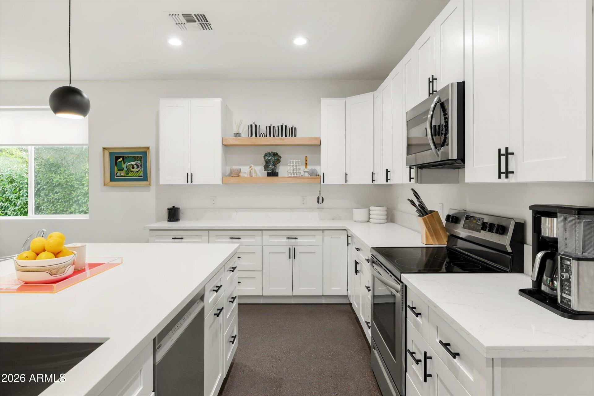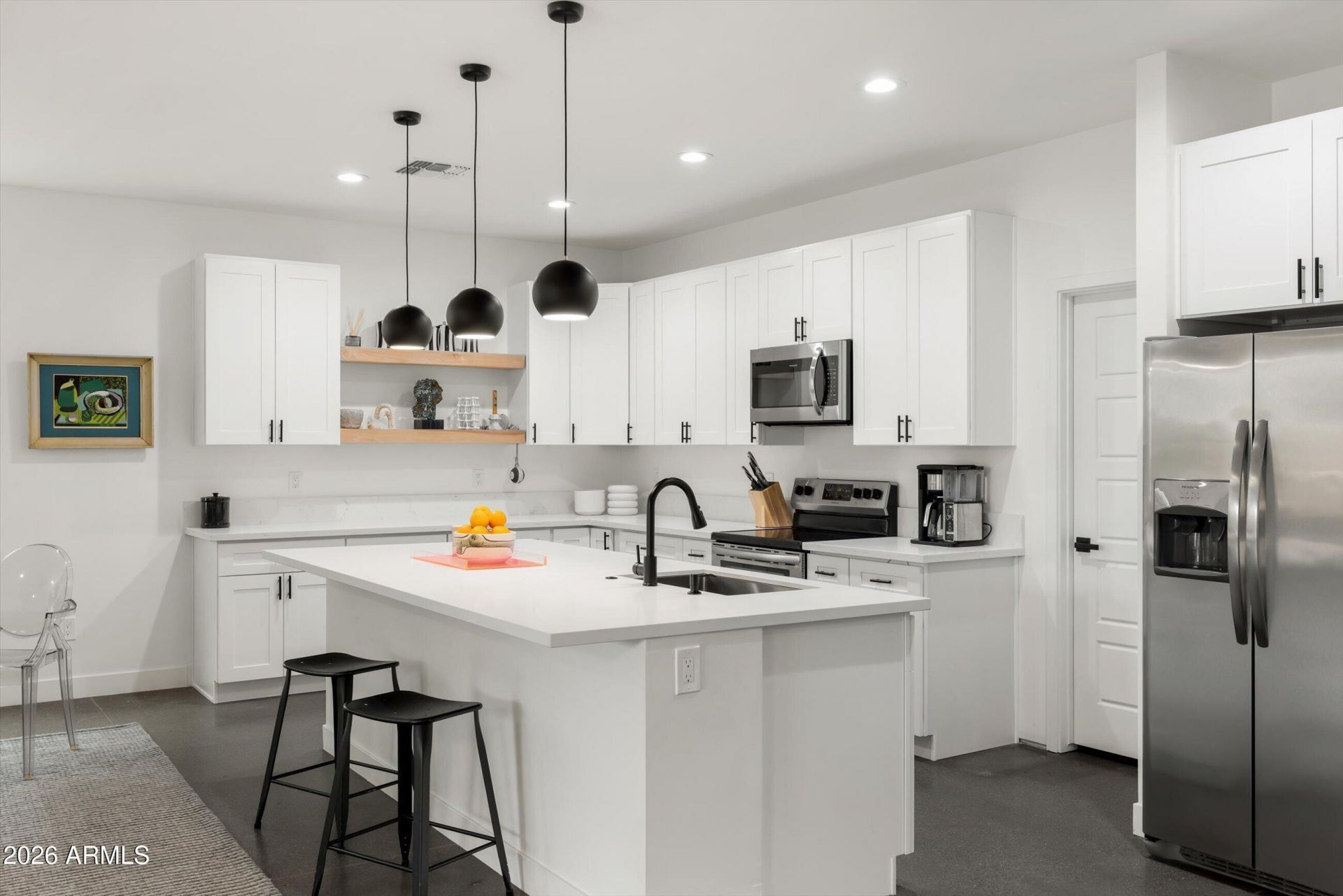 Welcome to this beautifully crafted 2021-built contemporary residence, ideally positioned at the end of an intimate five-home enclave. Thoughtfully designed with privacy in mind, the home is introduced by a serene front patio enveloped in lush ficus hedging, creating a peaceful, garden-like entry.Inside, a spacious open-concept floor plan unfolds with effortless flow, offering a light-filled great room anchored by clean architectural lines and modern finishes. Polished concrete flooring, 9+foot ceilings, clean lines & beautiful natural light enhance the homes refined, minimalist aesthetic, while designer lighting adds warmth and sophistication.The kitchen is both stylish and functional, featuring quartz countertops, crisp white shaker cabinetry, stainless steel appliances, open shelving a walk-in pantry, and statement pendant lighting. Flexible dining and living spaces make everyday living and entertaining seamless.The well-appointed primary suite offers a relaxing retreat, complete with a generous walk-in closet, dual vanities, and a sleek tiled walk-in shower. Three additional bedrooms provide versatility for guests, a home office, or creative space.Set on the largest lot in the community- over 8,000 square feet- the outdoor spaces are equally impressive. Enjoy a fully landscaped backyard with both covered and open-air patios, mature ficus hedging for added privacy, a grassy lawn, and low-maintenance gravel side yards.Additional highlights include a spacious laundry room with ample storage and a two-car garage with epoxy flooring.Perfectly located in North Phoenix, this home offers exceptional convenience with easy access to the Loop 101, SR-51, and nearby shopping, dining, and entertainment at Paradise Valley Mall- bringing the best of the area right to your doorstep.