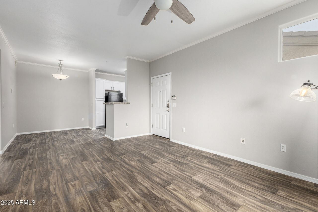 Improved Price! Exceptional privacy sets this move-in-ready, top-floor one-bedroom condo apart. Tucked into the rear of a coveted, resort-style gated community with no neighbor above, the home offers peaceful desert open-space views from a private balcony???ideal for relaxing at the end of the day. Modern upgrades shine throughout, including fresh paint, crown molding, and vinyl plank flooring. The updated kitchen features gas cooking, granite countertops, contemporary cabinetry, a modern backsplash, a distinctive copper sink, and all appliances included. Dual closets in the bedroom expand storage, and a sleek walk-in shower enhances updated bath. Enjoy resort-style amenities, including fitness center, heated pool & spa, business center, meandering walking paths, and covered assigned park With its pristine condition, desirable location, and vacation-like setting, this exceptional condo offers comfort, convenience, and a fun lifestyle. Dont miss your opportunity to make it yours.