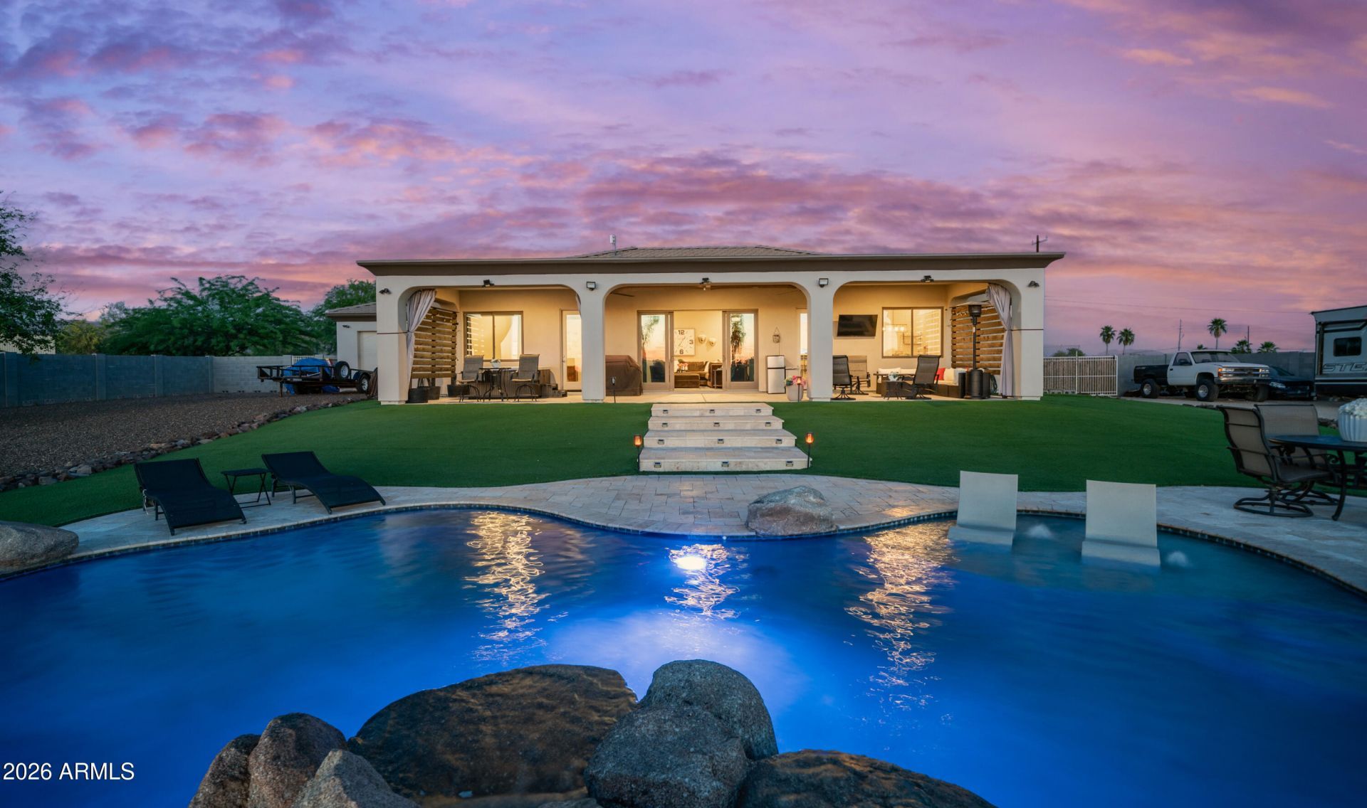 Experience majestic 360-views, where newer construction meets country! 1.019-acre lot, 2019 Built, 2522 sqft, 4 bedrooms, 3 bath, Linear Fireplace, 16,000 gallon Pebble-sheen pool w/ baja shelf, waterfall, bubblers & Pentair wifi control, 15 RV gate *No HOA *Car enthusiasts will appreciate the expansive 1,061 sqft 4 CAR-GARAGE w/: drive-through access, 8 doors & epoxy flooring *Luxury finishes & thoughtful design *Interior features: Open floorplan, Anderson multi-glass 116 slider overlooking unobstructive mountain views! *Chefs kitchen: QUARTZ, 42 shaker cabinetry, backsplash, s-s appliances, pantry, High Bar ISLAND seats 6, picturesque windows *Stylish baths all have TILED showers *(18x15) Primary suite: French door patio access, walk-in closet, designer ensuite has dual vanities, , soak-in tub, tiled shower w/glass enclosure *Utility room: sink & cabinets *Premium Tile *8 interior doors *Energy efficiency is prioritized with 18 SEER HVAC, Urethane open-cell foam insulation & dual pane windows, water softener*Exterior masterpiece includes: 50x14 Covered Patio, Spa, generous TRAVERTINE steps & decking around Sparkling pool w/boulders, Palms, Artificial Turf, complete rear BLOCK fencing for ultimate privacy, front chain link fencing w/rolling gate fully encloses acre! Extended driveway, mature trees, fully professionally landscaped yard! *4 way shared well *No back neighbors *Fully usable LOT (44,388 sqft) *Breathtaking views of surrounding ranges of the North Valley! Seamless indoor-outdoor flow, built for entertainment & relaxation. A perfect blend of modern, scale & versatility!..SO much to list. Near I-17, golf & shopping~ Tour Today!