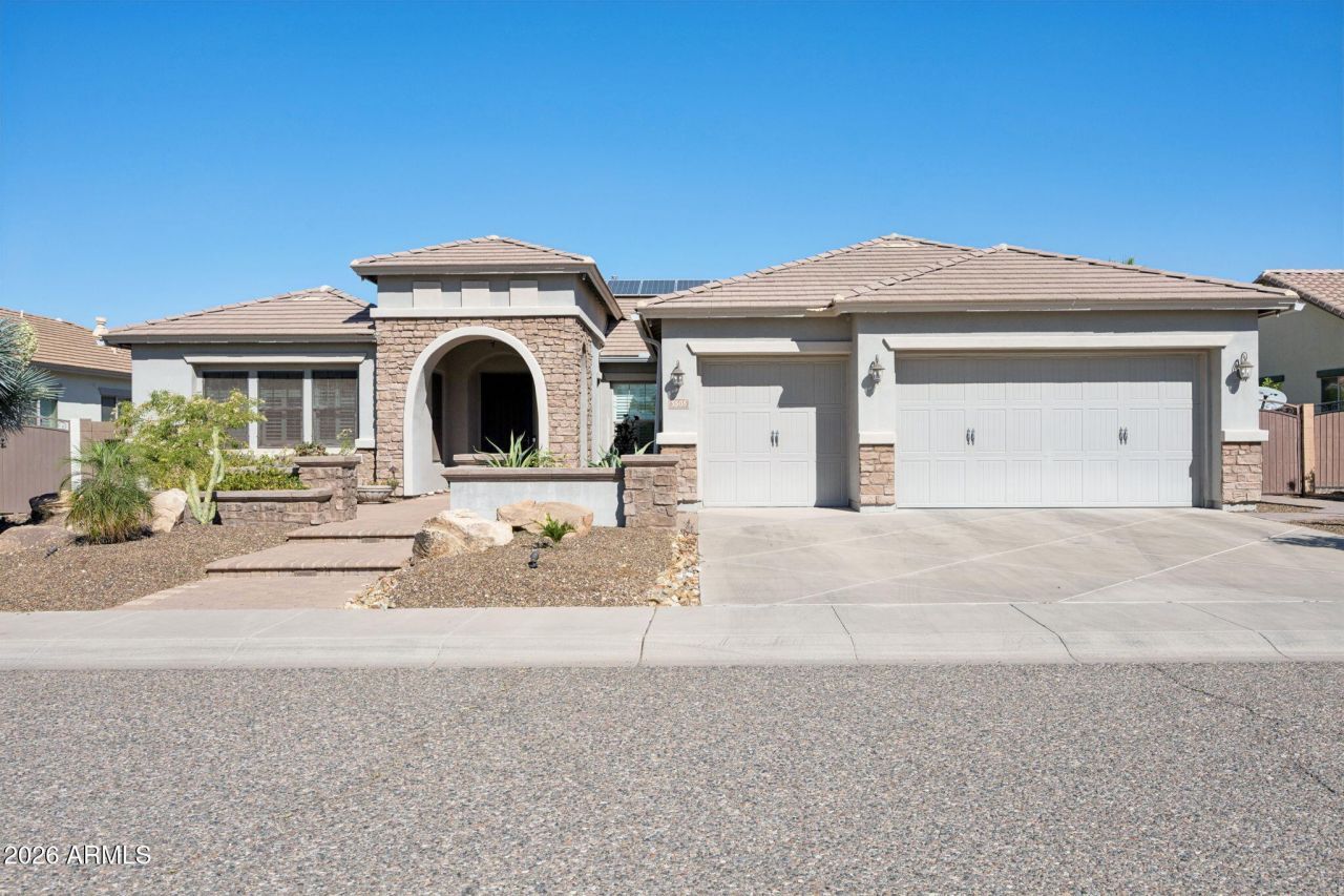 Nestled in the highly coveted Stetson Valley community, this stunning mountain-view home combines the best of single-level living with resort-style appeal. Set in a quiet enclave of only one story homes, the property combines upscale finishes with indoor-outdoor living space. The home features four bedrooms, a den, 3.5 baths, plus a private pool, spa, a large screened Arizona Room, and owned solar for efficiency and savings. A 3-car garage with a 4 ft extension, built-in cabinets, an insulated door, and overhead storage racks. Professional landscaping, lighted paver steps and paver patio enhances curb appeal. Inside enjoy hand-scraped wood-look tile floor, plantation shutters (on some windows), 7 crown molding, 5 baseboards and 16 tile throughout. No carpet.