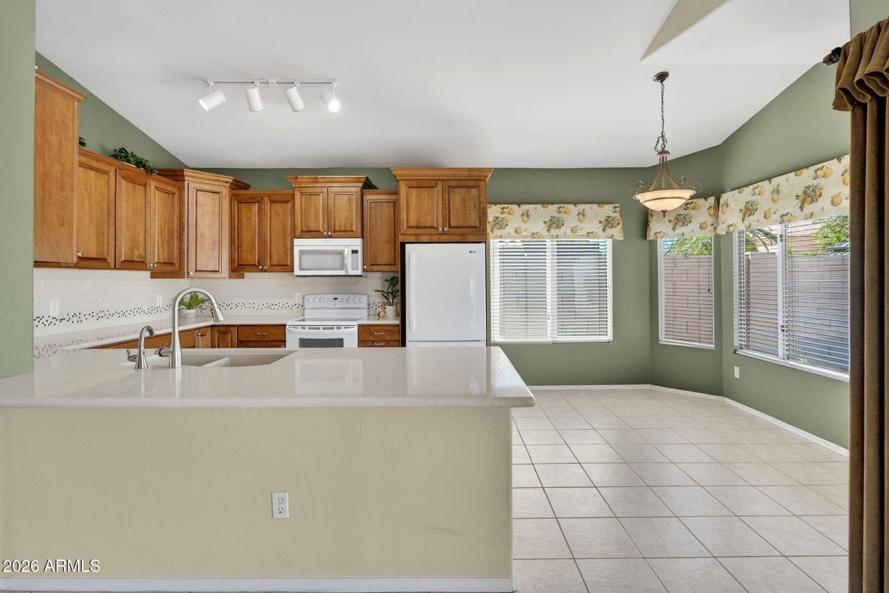 Spacious 3 bedroom + DEN home in desirable NE Mesa with 3 bathrooms and a 3 car garage. Vaulted ceilings and a cozy fireplace create an inviting living space. One secondary bedroom features its own private bath, ideal for guests or multigenerational living. The kitchen showcases upgraded cabinetry and a stylish backsplash with great storage. Split primary suite includes an updated bathroom and large walk-in closet. Enjoy an oversized backyard with covered patio, perfect for relaxing or entertaining. Newer roof and AC. Conveniently located near freeway access, Sprouts, dining, and entertainment.