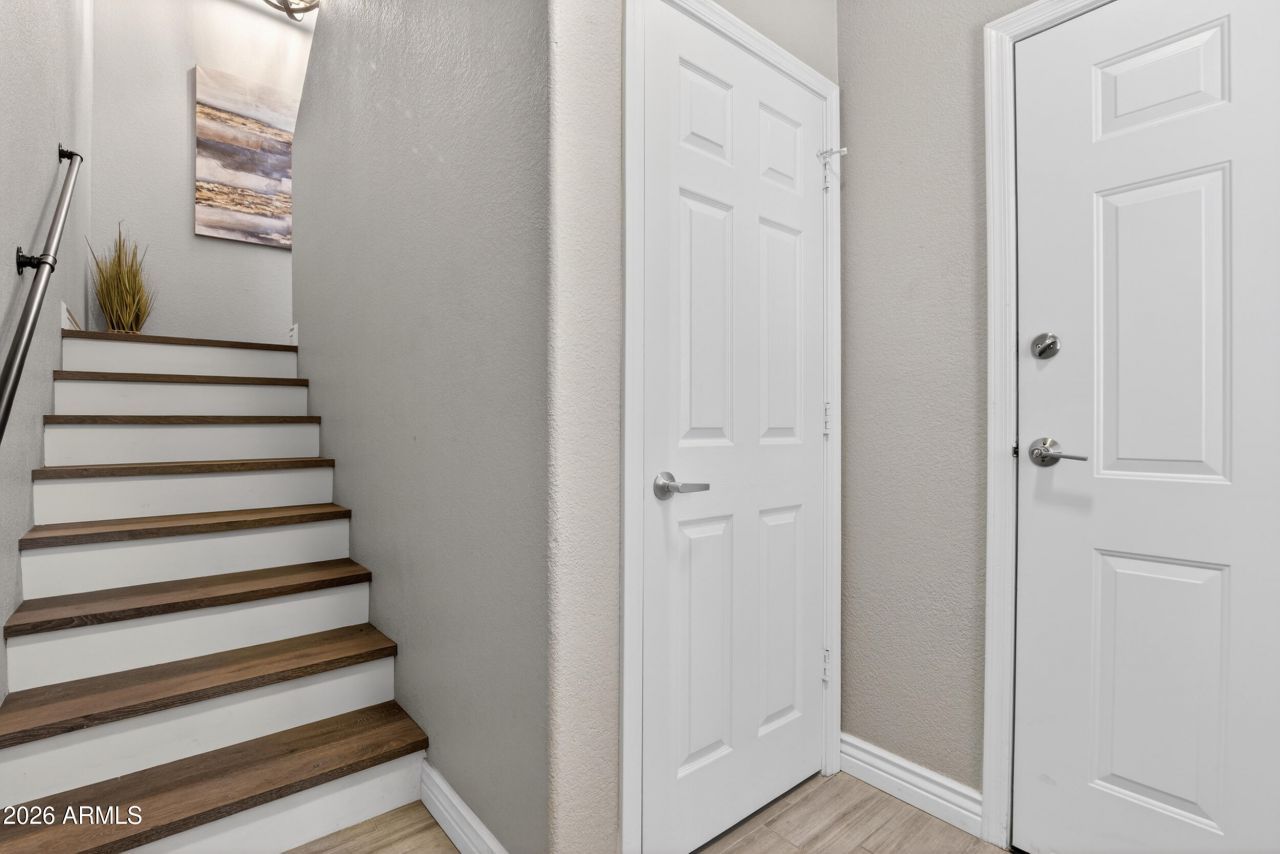 Fairways at Arrowhead-resort living in Glendale. Highly upgraded, stunning condo located steps from the pool/spa. Enter this 2nd floor unit via private stairway. You will be charmed by the bright light & modern finishes. Open floorplan. Kitchen features white shaker cabinets, glass tile backsplash, quartz countertops & SS appliances. Primary bedroom has en-suite bath w/ walk-in tiled shower, walk-in closet & pool view. Enjoy breakfast or afternoon cocktails on the private balcony. Garage w/ direct access to home-parking for 2 additional cars in driveway. This unit is partially furnished w/ a complete dining set & breakfast bar seating. High quality sun shade window coverings. In unit full-size washer & dryer. New HVAC in 2021. Close access to Loop 101, shopping, dining & sporting events.