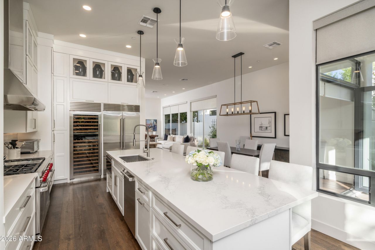 Unparalleled Scottsdale luxury awaits in the guard-gated enclave of 7600 Lincoln. This impeccably reimagined single-level residence has undergone a complete top-to-bottom renovation, offering 2 bedrooms and 2 bathrooms designed for effortless sophistication. At the heart of the home, the chefs kitchen impresses with custom cabinetry, a sprawling statement island, and Wolf appliances, including a large wine refrigerator. Engineered hardwood flooring flows seamlessly throughout expansive living spaces, enhanced by abundant natural light pouring in through oversized windows and doors.Step outside to a meticulously designed, low-maintenance outdoor oasis featuring a built-in grill with bar seating and a cozy fire pit ideal for hosting guests.This home is sure to please.
