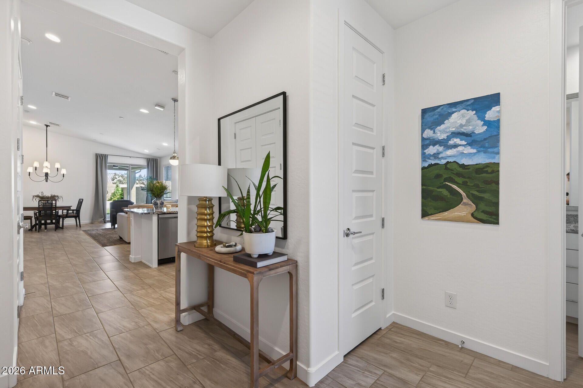 Welcome to 9558 E Tesla, a beautifully maintained, single-level home tucked in one of Mesas most desirable communities, Cadence at Gateway.Built in 2020 by Lennar, this Lewis model sits on a truly special lot with no neighbors in front or behind, offering rare privacy. With 5 bedrooms, 3 full bathrooms, and an open, airy layout, this home was designed for both everyday living and easy entertaining.Step inside to soaring ceilings and a bright, open-concept kitchen and living space that instantly feels welcoming. The kitchen is crisp and timeless with white shaker cabinets, a tiled backsplash, granite countertops, stainless steel appliances, and a large pantry. This is the kind of space that naturally becomes the heart of the home. The primary suite is a calming retreat, complete with dual sinks, a spacious walk-in closet, and a beautifully sized shower. Five full bedrooms offer incredible flexibility for a home office, playroom, guest space, or whatever this season of life calls for.Out back, youll find a low-maintenance yard made for enjoying Arizona living: a covered patio, turf, a built-in trampoline, and raised garden beds.Recent improvements include: exterior pavers, turf, garden beds, electric car charger, and interior paint.Cadence at Gateway is known for its resort-style amenities, including: a community center, game room, pools, hot tub, fitness center, tennis, basketball and bocce courts, walking paths, multiple playgrounds, and more. All just minutes from the 24 Freeway and everyday conveniences, right here in the East Valley.This one checks all the boxes - Welcome Home!