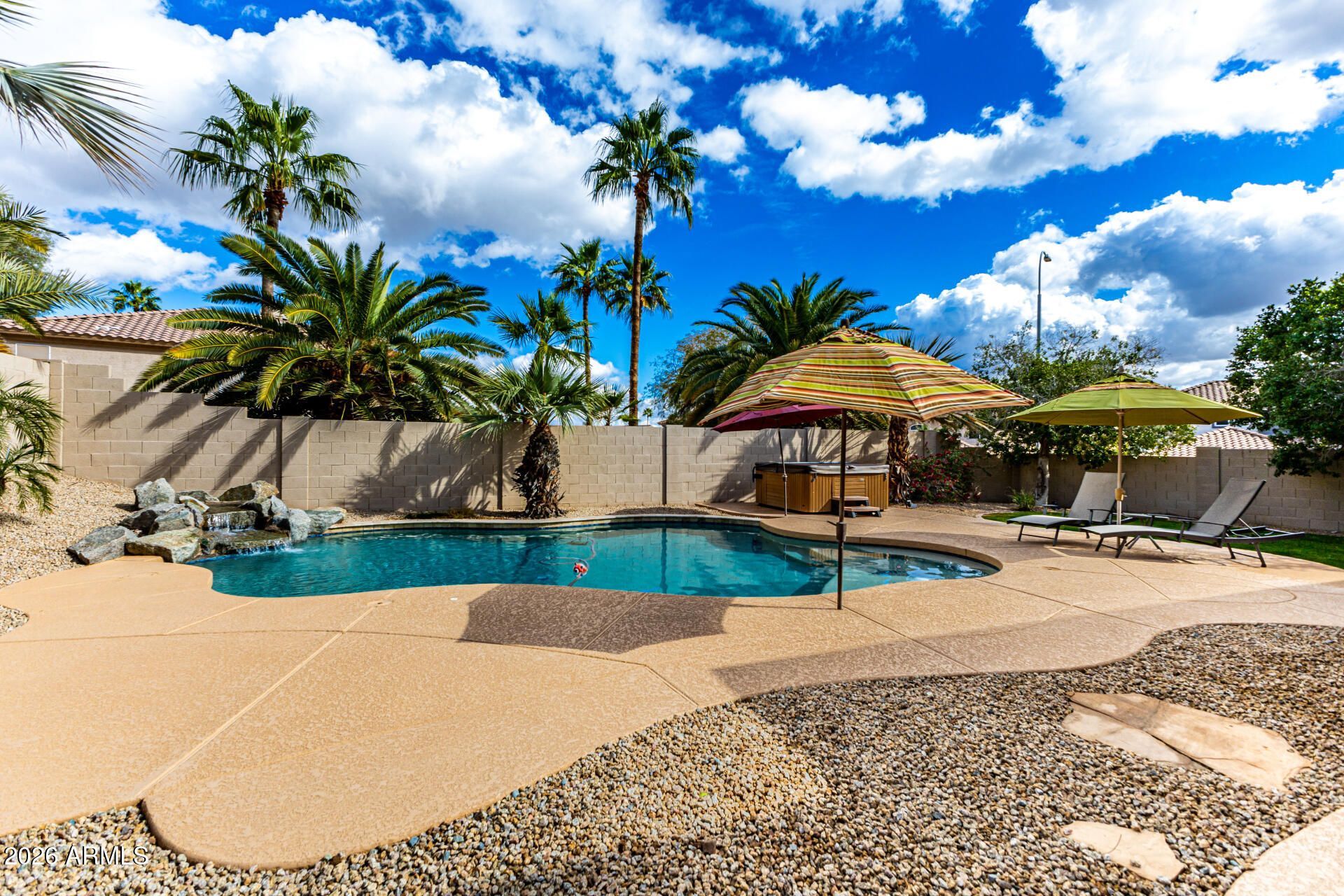 Ocotillo living in Chandler at its finest! Large, elevated corner lot with almost 3500 sf of living space. 5 roomy BRs, 3.5 BAs (ensuite downstairs), den, and bonus/media room off the great room. Kitchen features an expansive granite island, Blanco sink, RO system, pull-out shelves, lighted cabinets/under cabinet lighting, wine fridge, trash pull-out, and SS appliances. W/D, storage closets, freezer, fridge in laundry room. Soft water system. Luxurious spa-like primary bedroom ensuite features a stand-alone soaker tub, multi-head shower system, stunning cabinetry, and thoughtful niches for your personal care needs. 2021 remodeled pool, BBQ island, spa, grassy areas and expanded covered patio. New roof, AC 2021, new int paint 2026. Original owner. Near tech corridor, 101, 202, A+ schools!